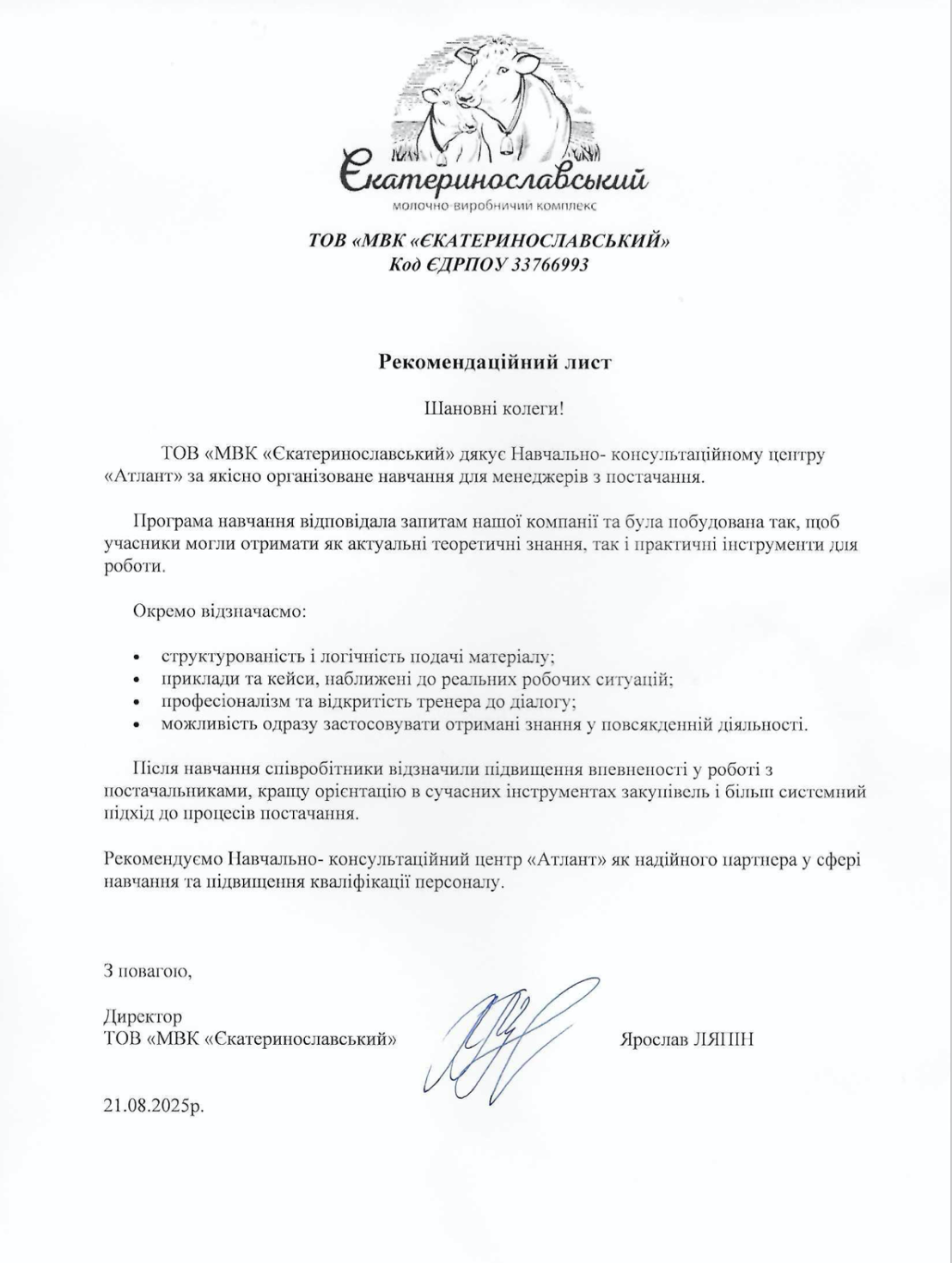 Співпраця з НКЦ «АТЛАНТ» була спрямована на підвищення професійного рівня менеджерів із постачання через навчальну програму «Ефективний менеджер із закупівель».